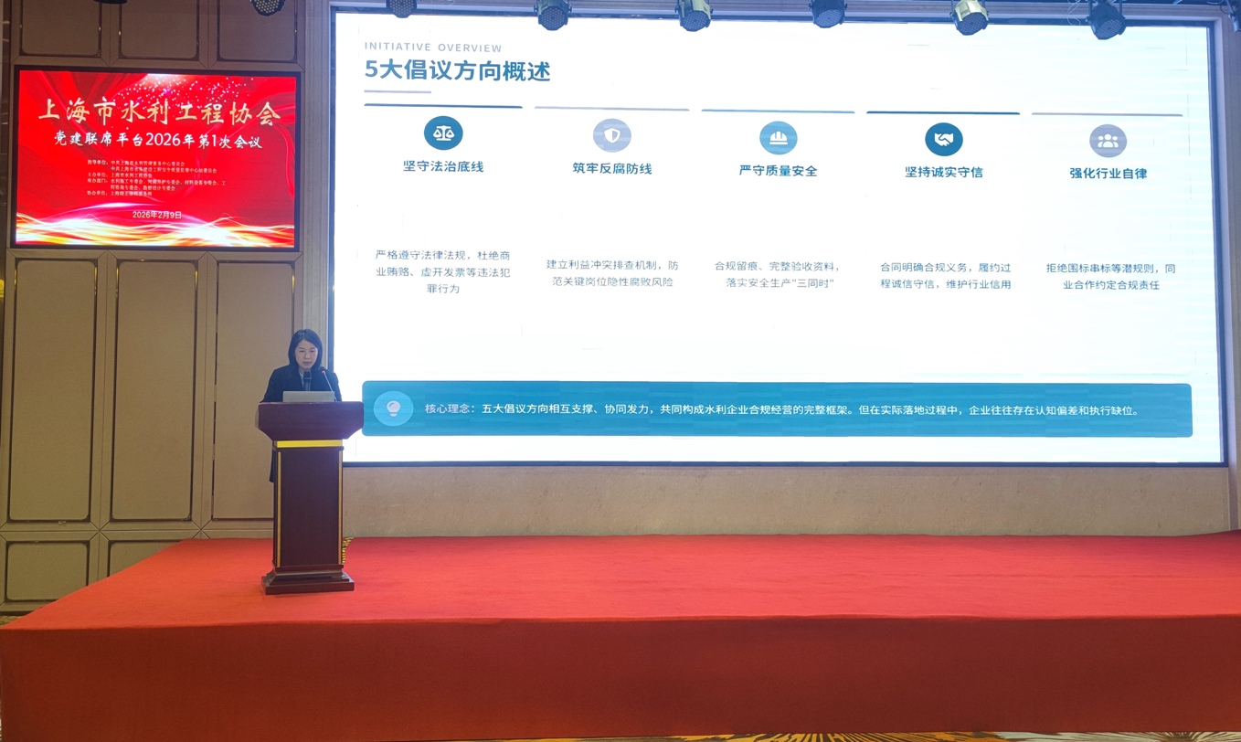张林辉常务副会长在主持中,感谢大家一直以来对水利工程协会各项工作的大力支持,并向全体会员单位致以亲切的新春祝福。此次活动通过发布倡议、表态承诺、专题辅导,进一步统一了合规经营的思想认识,明确了上海水利行业高质量发展的行动方向。协会将坚持党建与业务融合发展,引领推动广大会员和水利行业高质量发展,为上海城市水安全筑牢坚实根基。